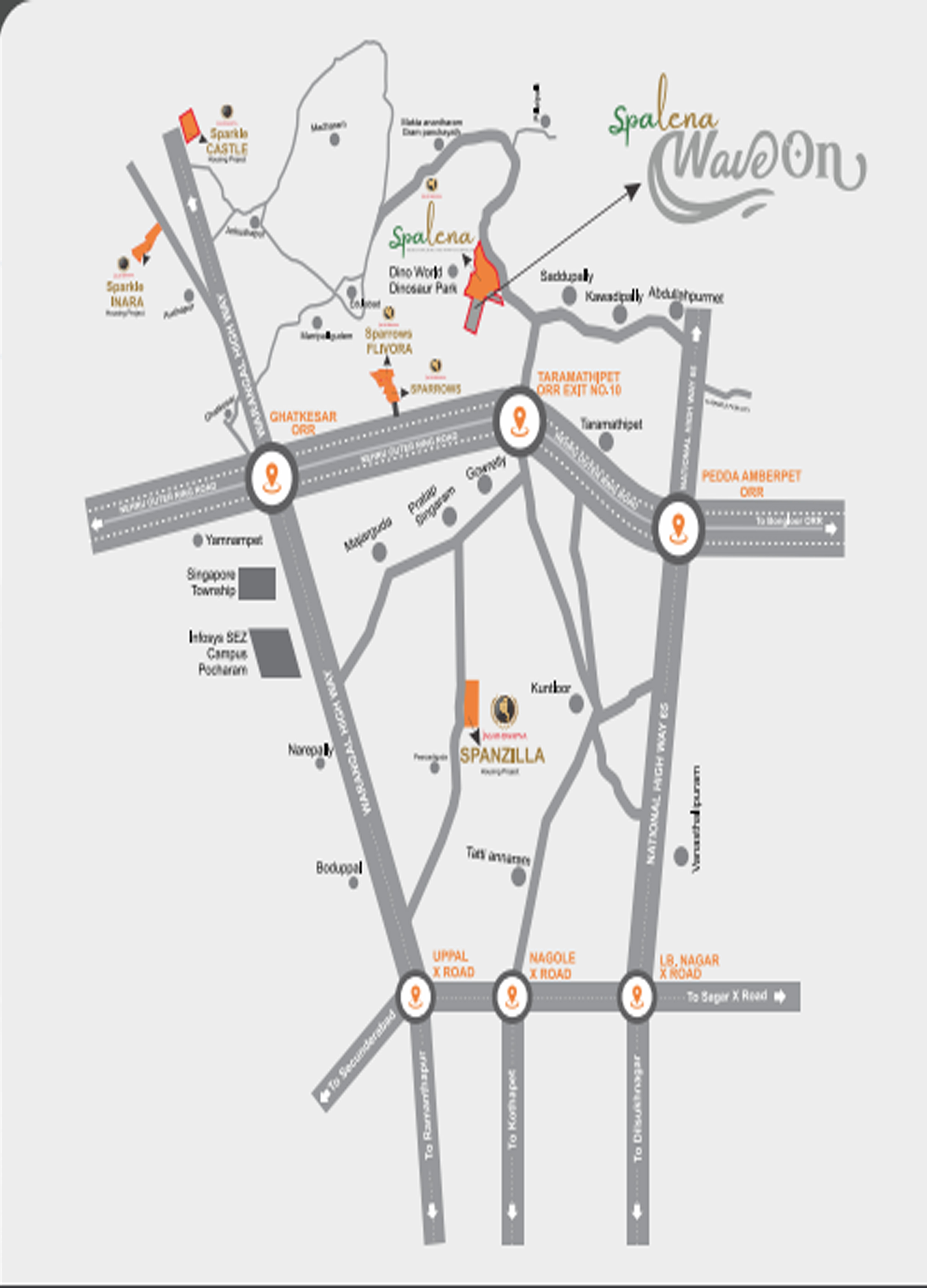 Bandaravirala is very near to Outer Ring Road Exit No 10, towards East Hyderabad. Bandaravirala is on the 100 ft Connecting road from Warangal Highway To Vijaywada Highway, Growing facilites in the vicinity has made SPALENA WAVEON, an iconic venture for both a discerning investor and an individual looking for a place to construct his dream house, Your new home is truly amazing, spanning across 46 Acres of splendid beauty, surrounded by blissful greenery, a wealth of natural light and fresh air, well connected Infrastructure adjacent to grandeur theme park Dino World, Valuation of your investment made today would scale_up further, It is an outcome of diigent planning and thorough ‘market research that makes SPALENA WAVEON a planned venture,